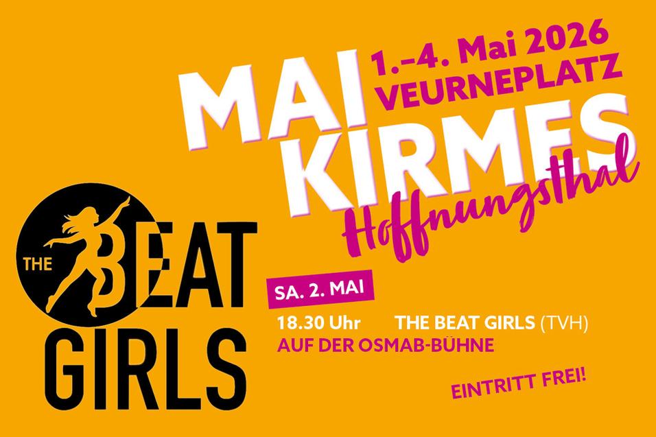 Auf der traditionellen Mai-Kirmes auf dem Hoffnungsthaler Veurneplatz treten auch in diesem Jahr wieder die Kinder und Jugendlichen aus unserem TVH-Tanzkurs „Video-Clip-Dance“ auf. Unter dem Namen „Beat Girls“ zeigen sie ihre einstudierten Choreografien auf der Bühne.